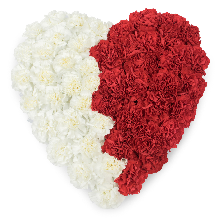 Embrace the grace and beauty of our heart-shaped mixed carnations arrangement, featuring a stunning combination of white and red carnations. Each flower is hand-selected to ensure ultimate freshness and quality.